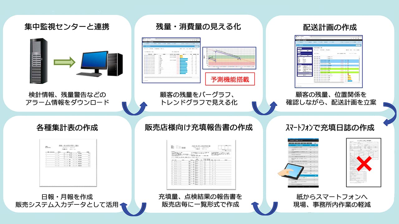 本製品はLPガスの配送効率化を目的として、ガス残量などの情報を分析・活用し、残量の監視や配送計画の立案、販売店様向け充填報告書の作成といった業務をサポートする支援システムです。