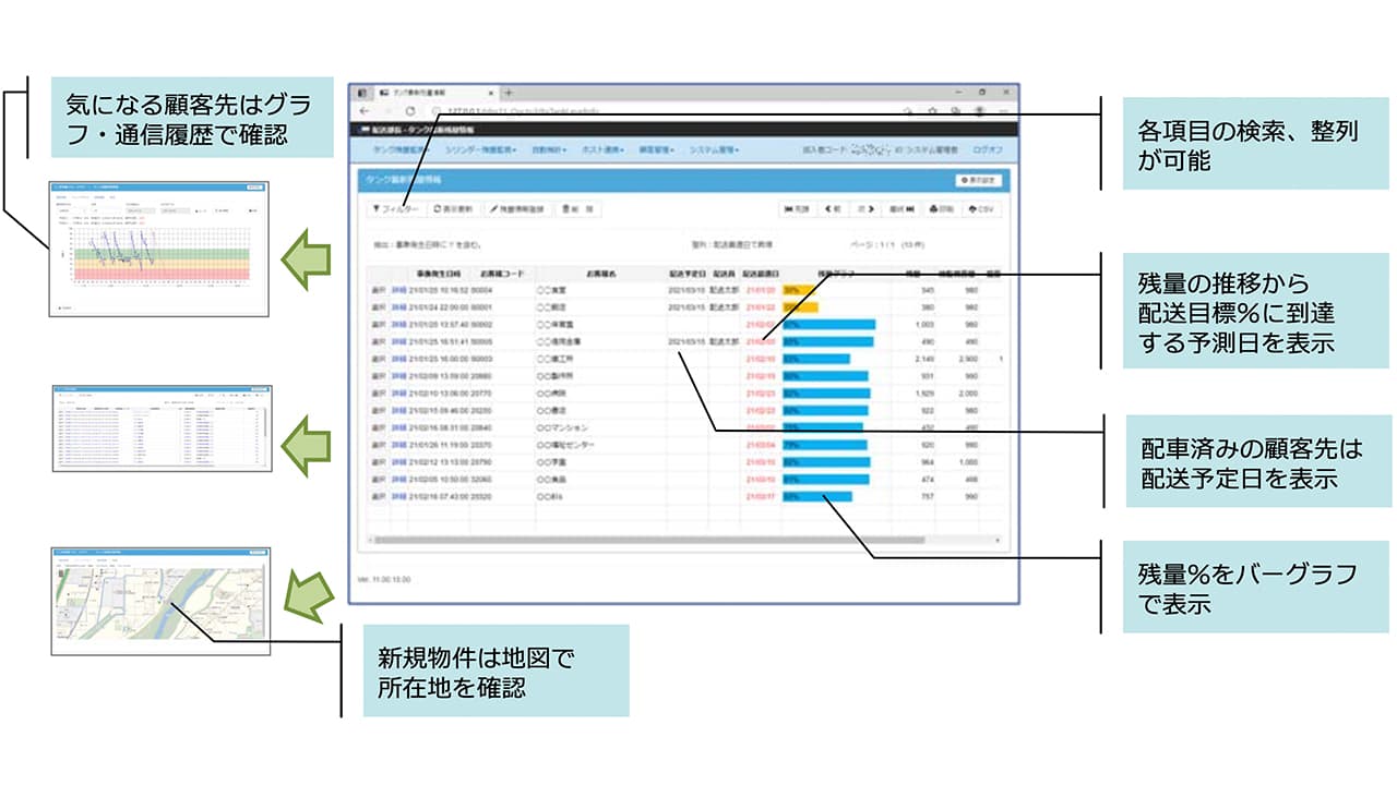 タンクの残量推移から、設定した配送目標%に達する日付を自動予測。猶予日数に応じて表示色が変わるため、緊急度が一目で分かります。配送予定日や未返伝の有無も確認可能。残量%はグラフで可視化し、閾値で色分け。検索・並び替えで、目的別のリストを簡単に作成できます。