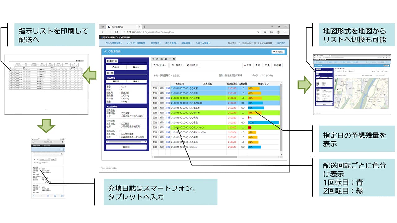 | 最新残量情報ページ | 残量・到達予測・猶予を自動計算して色分け表示。検索・並べ替えに対応し、地図で位置を即確認。 | 緊急度を一目で把握し、優先配送先を素早く抽出。 |